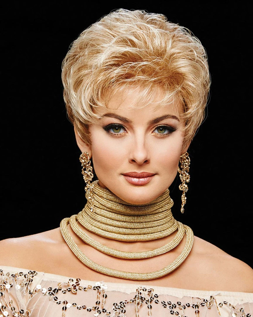 Short, waved layers beautifully blend to a neck-hugging, tapered nape.