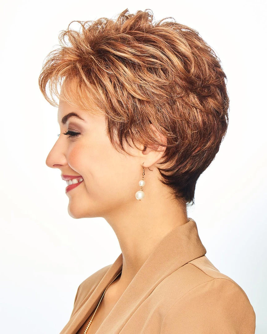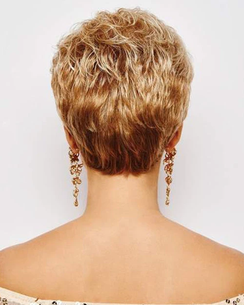 Short, waved layers beautifully blend to a neck-hugging, tapered nape.