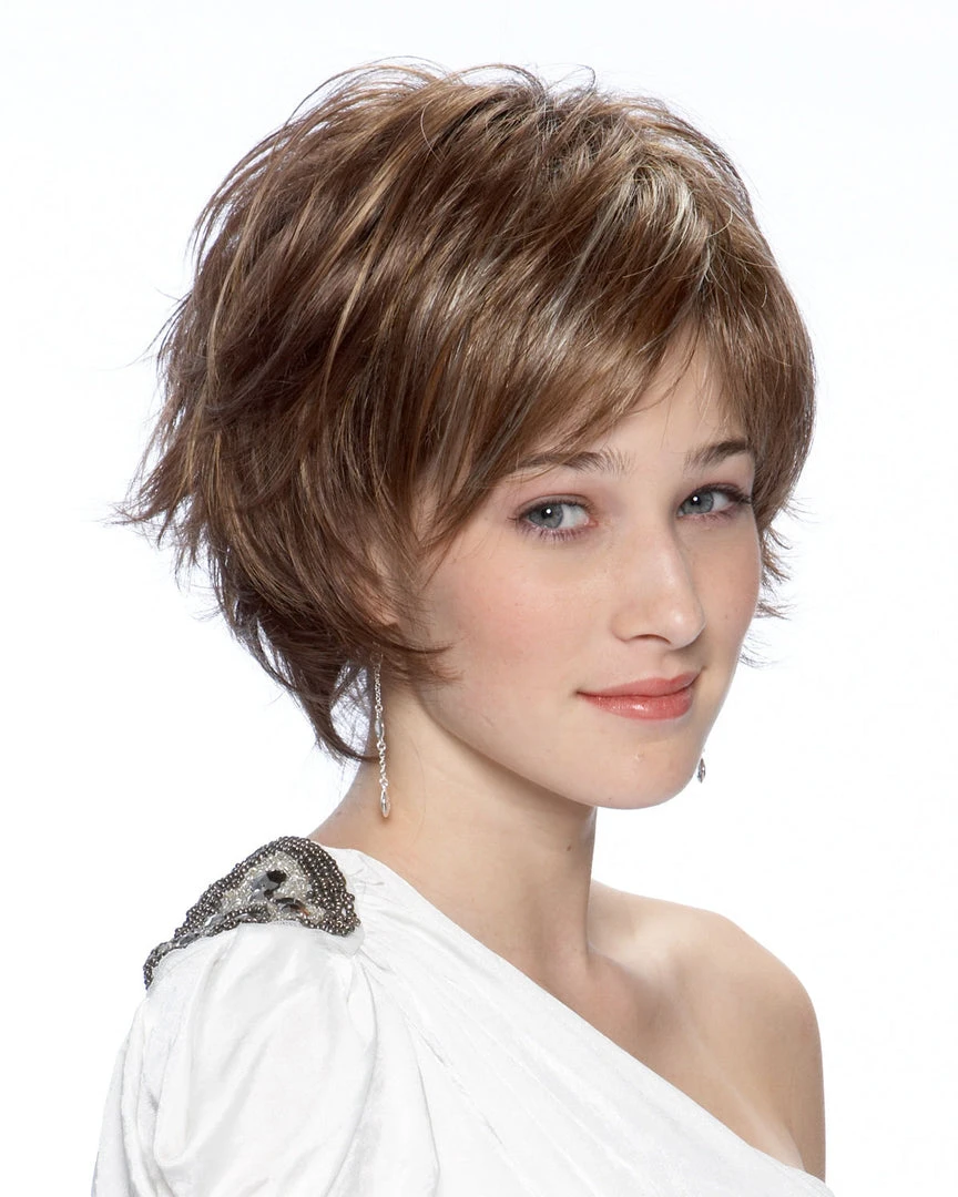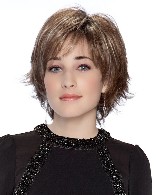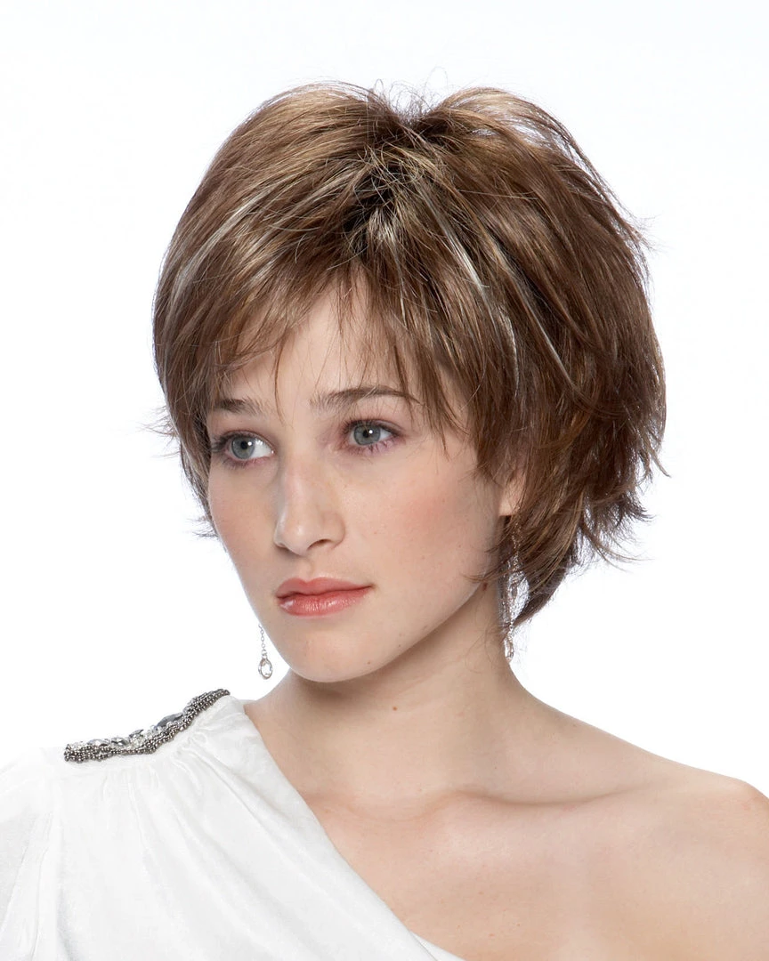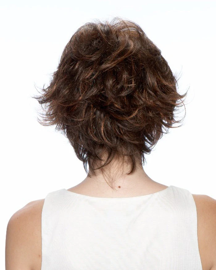 This flattering shaggy bob compliments the face with a cavalcade of wispy disconnections and volume. A razor-finished silhouette gives additional movement to this short textured style. An open capless wig construction of thin spaced wefts make up the inside of cap, providing airy lightweight ventilation. A style worn casual or dressed up, it provides a gorgeous and easy way to update your look without the fuss.