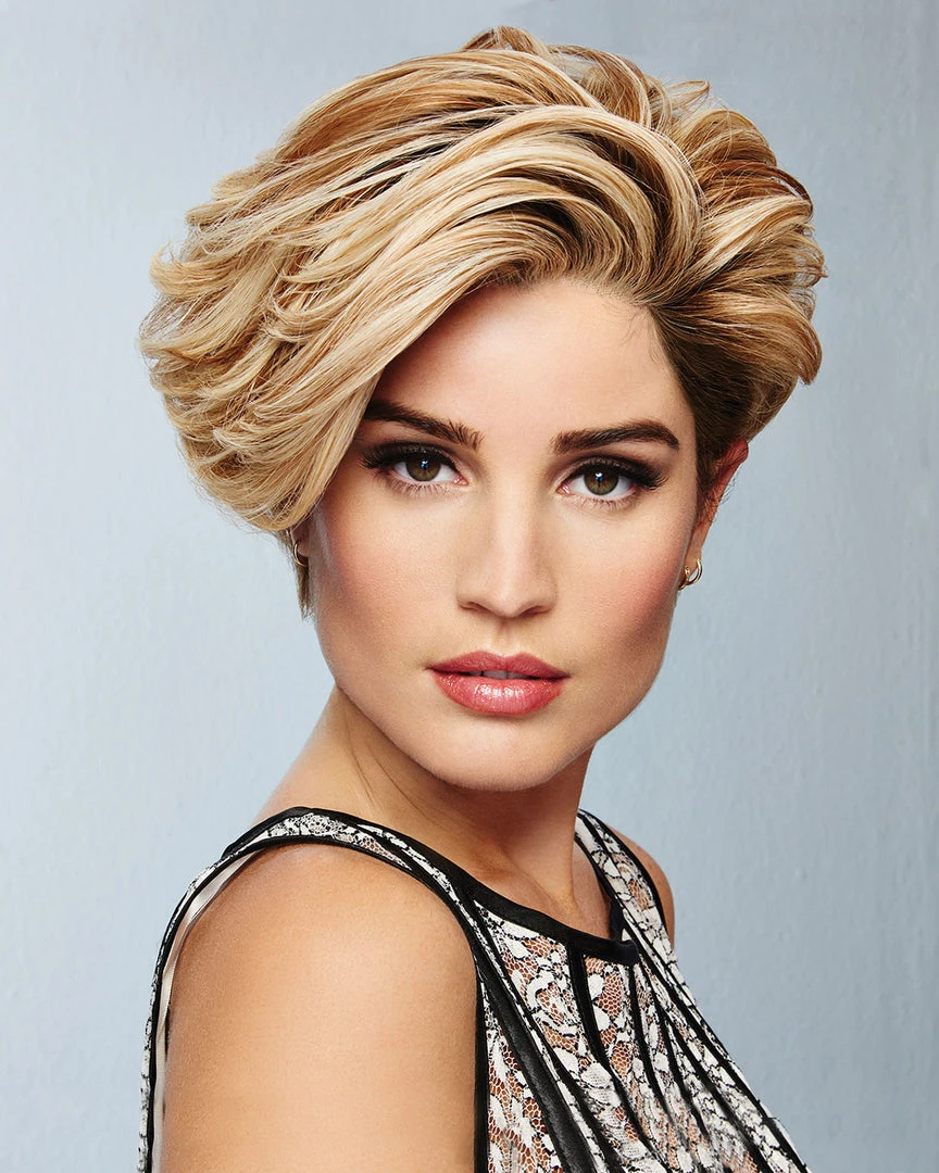 The Calling All Compliments Wig by Raquel Welch has a French Drawn lace front monofilament top means versatile styling options are a given with this timeless short cut. Soft sweeping lengths at the front can be made to fall gently to the side or styled up and away from the face. Tapered lengths in the back can be worn gently hugging the neck, or sculpted to create a more dramatic effect. 100% cuticle aligned Remy human hair allows for quick, easy styling, and the 100% hand-knotted base affords natural movement.