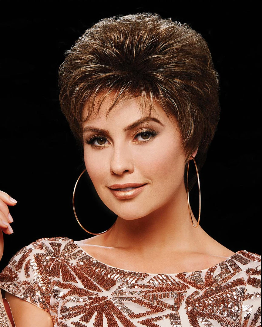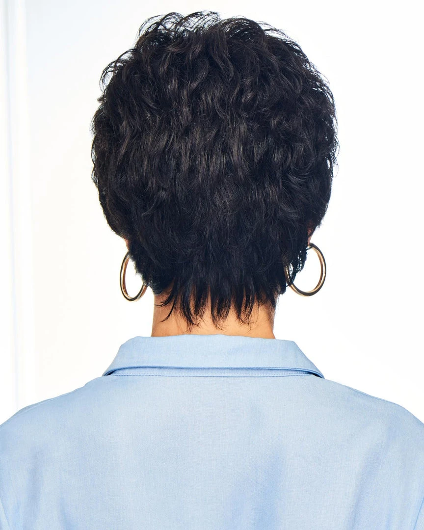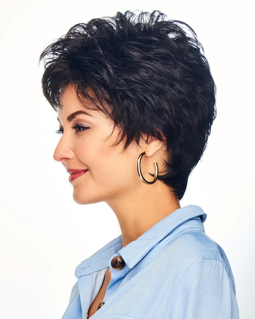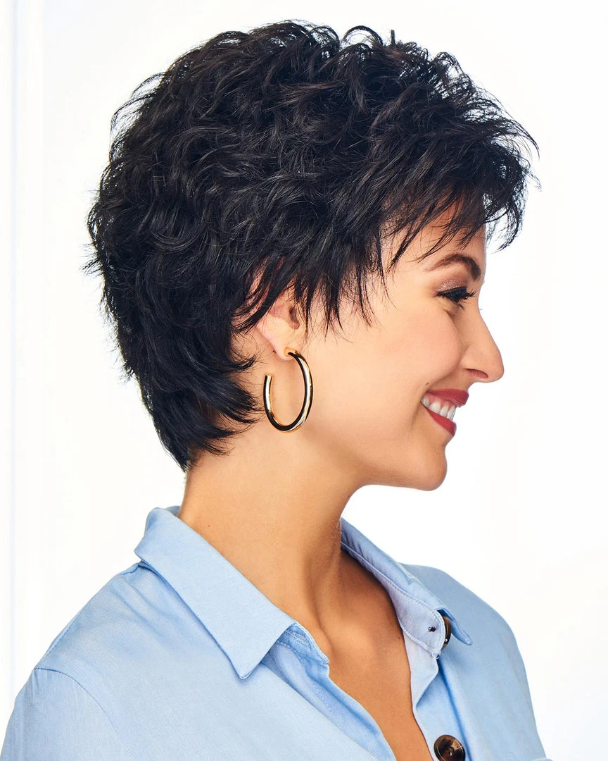 A short shag silhouette featuring slightly waved all over layers that fall to a collar length nape.