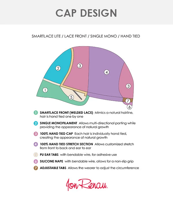 With the unique SmartLace™ Lite cap, Carrie, Jon Renau’s best-selling shoulder-length bob gets the ultimate upgrade to achieve a new level of luxury. Carrie Lite features a seamless lace front that extends from ear to ear for the most realistic hairline, a hand-tied mono top that allows for multi-directional parting, and light hair density for the most natural look.