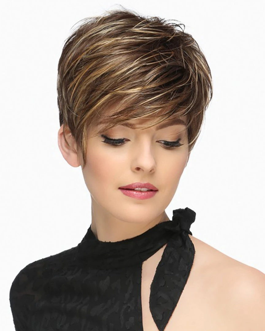 Have fun with Jett, a bold, asymmetric pixie featuring a sheer lace front. Subtle layering allows for natural movement, so you can muss her up for a sleek and edgy look or keep it soft and simple.