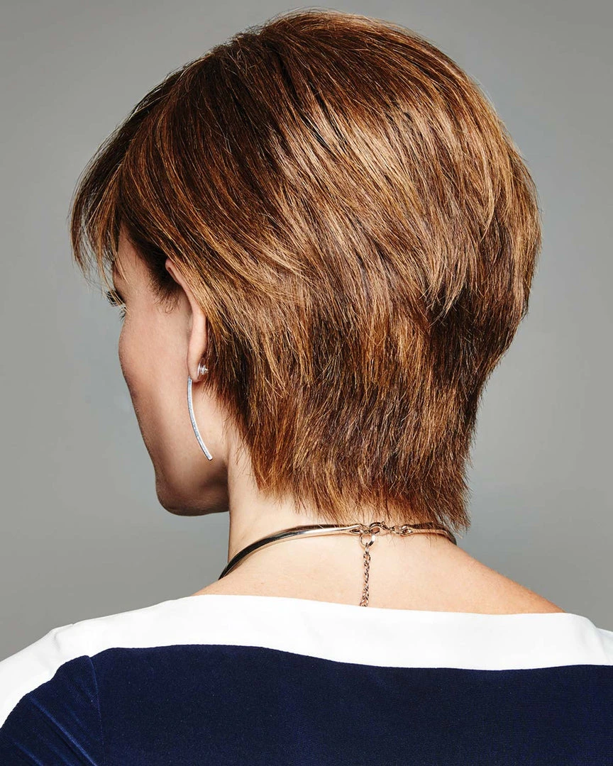 Without Consequence brings style and sophistication to an edgy haircut. The tattered layers can go edgy one day or classic and sleek the next. Style the fringe sultry and soft or back and bold, the choice is up to you. The lace front hairline is virtually invisible, allowing off-the-face styling. The Sheer Indulgence monofilament top creates natural movement and offers additional styling versatility. Our patented Memory Cap base is comfortable, breathable, and ready for anything that comes your way.